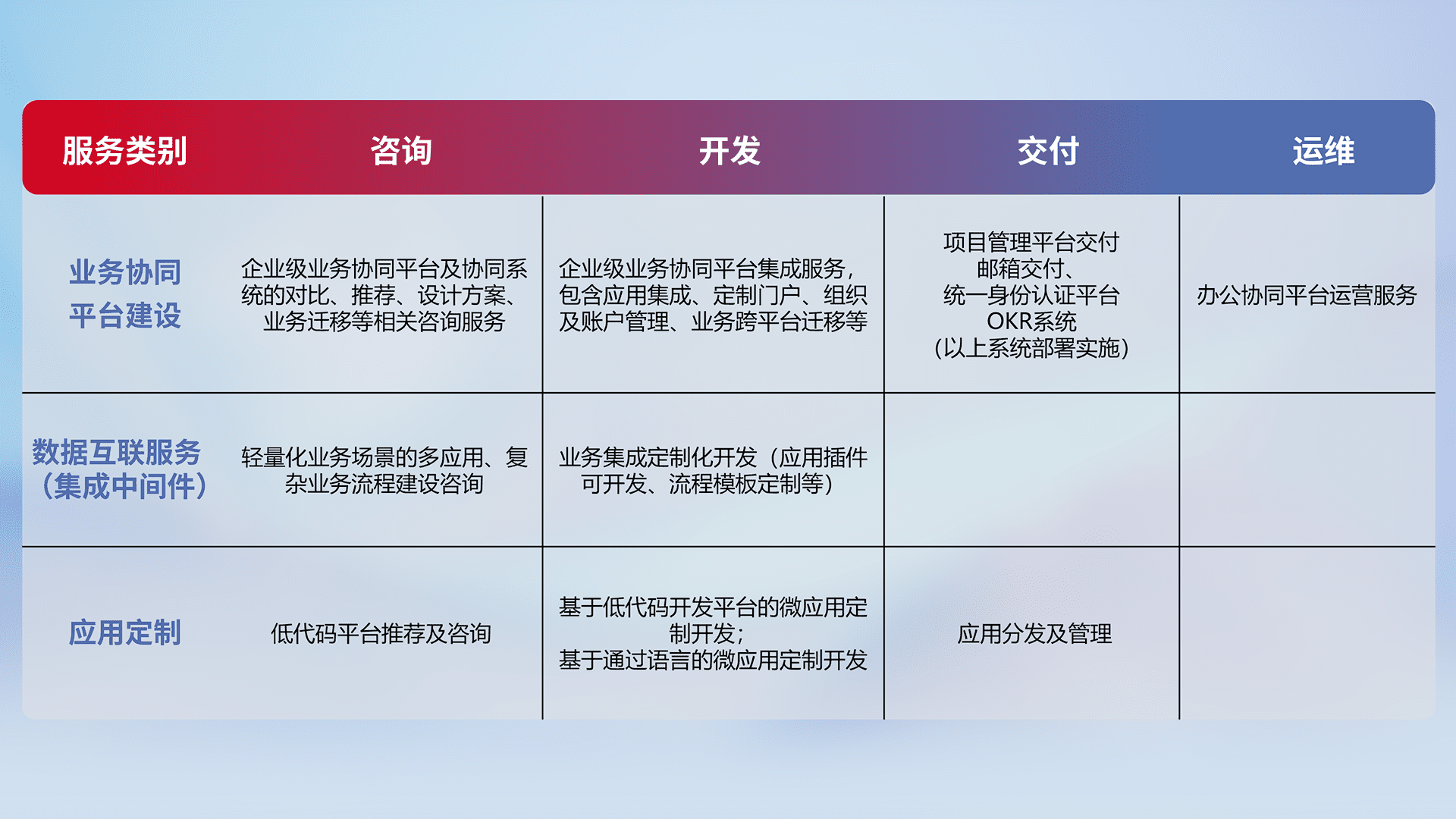 针对钉钉、、、、企微、、、、IDaas等平台级产品提供产品的规划、、、方案、、交付、、定制化开发等服务,,实现如统一协同办公、、、智能客户服务、、、混合会议管理、、、智能数据查询、、、、等业务场景,,实现数字化转型。。。。