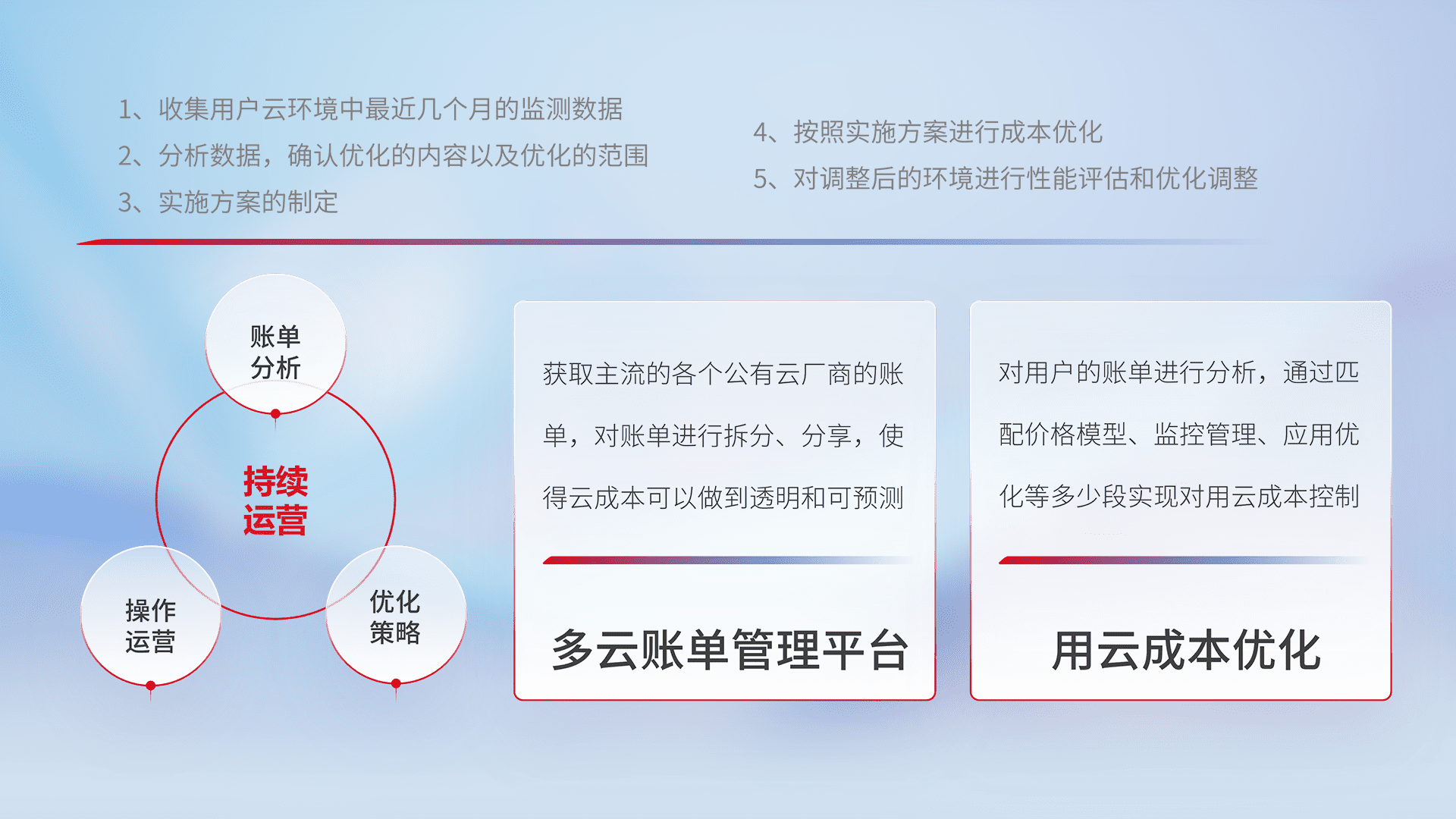 通过多云纳管,,以统一的资源数据模型把客户的云资源进行抽象和封装,,,进而实现对多云资源的统一操作,,保障云资源管理的可靠性、、、、稳定性与可用性。。量身定制化运维内容,,,配置、、开发运维、、、补丁管理、、、备份、、、、监控、、、认证和访问管理、、、审计和日常巡检等,,保障在用云过程中的可靠度,,,,稳定度以及高可用率。。。